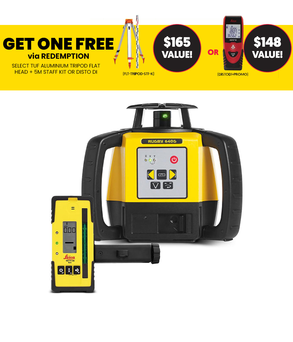 The Leica Rugby 640 Rotary Laser Level is a multi-purpose self-leveling vertical, horizontal, manual and 90-degree slope in dual axis construction laser level. With a range up to 2,000 feet with the Rod-Eye laser receiver, this is great for both indoor and outdoor applications. Also, the Rugby 640 is self-leveling within ±5 degrees and has an accuracy of ±1/16 inch at 100 feet.