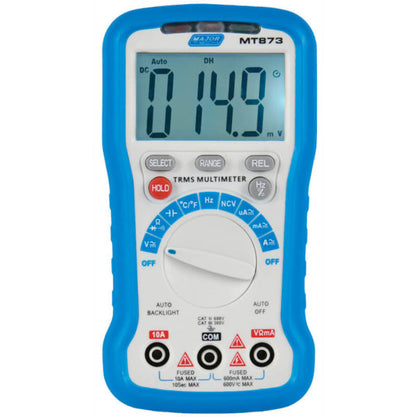 The MT873 is a True RMS multimeter and can be used to measure AC/DC voltage, AC/DC current, resistance, capacitance, frequency, duty cycle, Non Contact AC Voltage (NCV) detection, diode test and audible continuity. It also features a data hold & relative mode functions. This multimeter is a slim sized, portable, robust drop proof digital multimeter has a 6000 count digit LCD monitor with large 25mm digits that offer clear and easy reading. The circuitry design is centred on large-scale IC A/D converters in conjunction with an over-load protection circuit, the meter offers excellent performance and is ideal for a versatile digital multimeter.